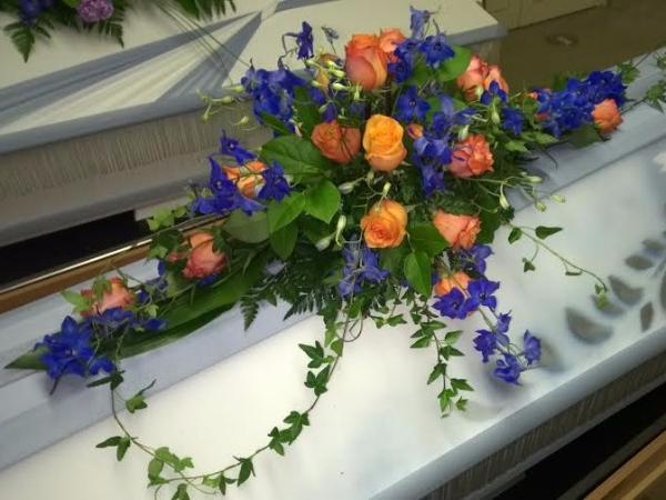 Arkkulaite oranssista ruususta ja sinisestä ritarinkannuksesta. Sisältää kuljetuksen Riihimäen kappelikirkolle.