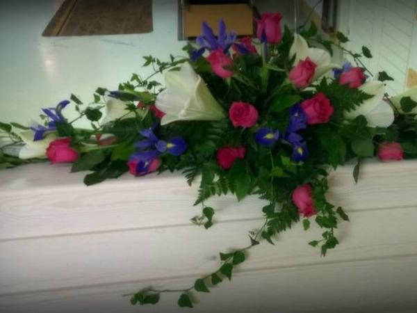 Arkkulaite aniilinpunaisista ruusuista, iiriksistä ja valkoliljasta. Sisältää kuljetuksen Riihimäen kappelikirkolle. HUOM! tilaukset viimeistään 5 arkipäivää ennen tilaisuutta.