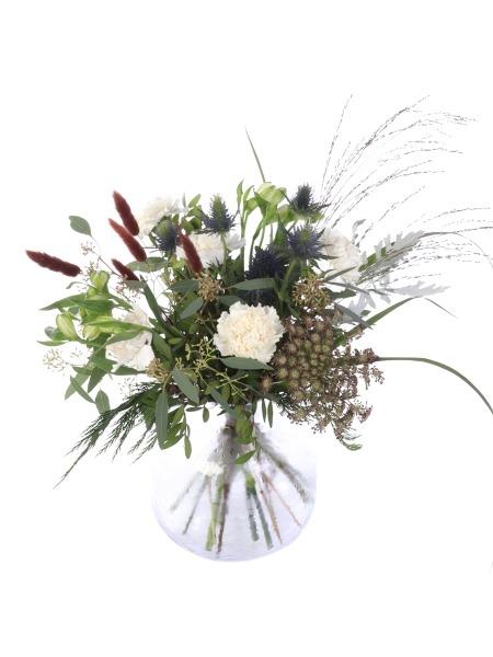Rento ja rempseä kimppu, jossa valkoisten neilikoiden kaverina inkaliljaa, piikkiputkea, jänönhäntää, heinä ja erilaisia vihreitä.