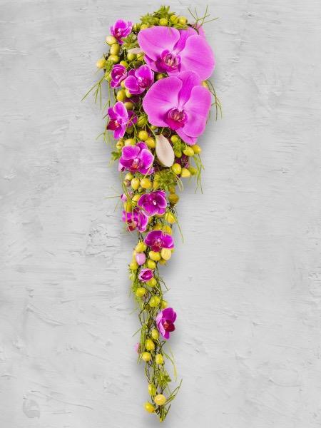 Valuva orkidioista tehty hääkimppu.