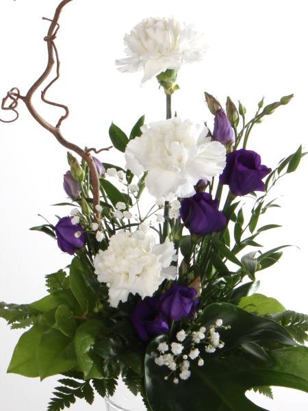 Korkea, ilmava kimppu vaalean ja lilan sävyissä. Kimppu sidotaan kaupan valikoimien mukaan.