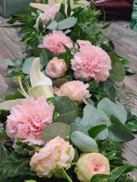 Erilaisistakaupan valikoiman mukaisista vihreistä ja floristin valitsemista kukista tehty kaunis kukkaköynnös pöydälle, oven yläpuolelle tai mihin vain keksit sen sijoittaa.