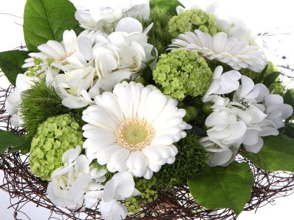 Matalakimppu valkoisista ja vihreistä kauden kukista risupohjassa.