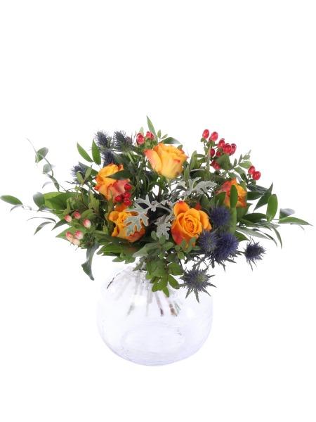 Matala kukkakimppu oranssista ruususta, marjoista ja muista syksyisistä materiaaleista. Ruusun sävy ja muu materiaali valitaan kaupan valikoiman mukaan.