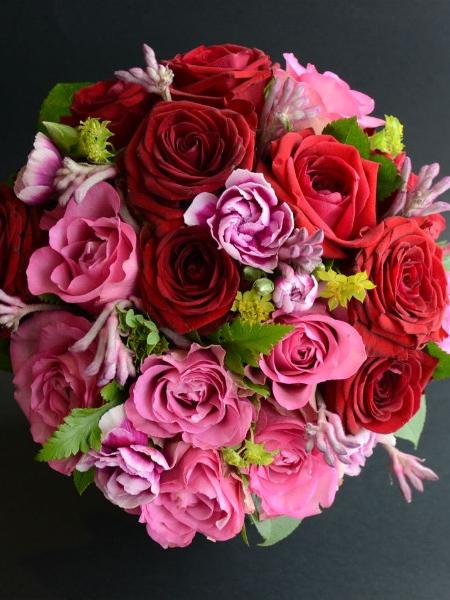 Pyöreä kimppu vaaleanpunaisista ja punaisista ruusuista sekä neilikoista.