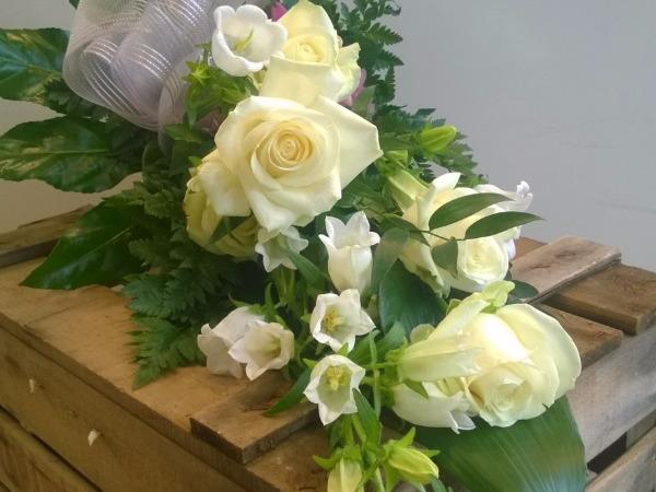 Valkoinen ruusupohjainen surukimppu. Lisäkukkina käytetään kauden valkoisia kukkia. Rusetti ja kortti sis. hintaan. Huom! Tilaus tehtävä viimeistään 3 arkipäivää ennen tilaisuutta.