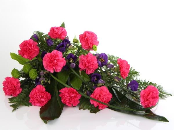 Surulaite pinkeistä neilikoista ja sini-liloista eustomoista. Rusetti ja kortti sis. hintaan.