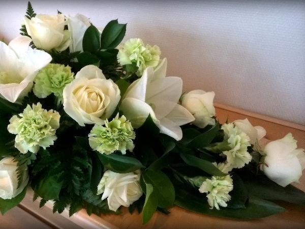 Valkoinen ruusupohjainen surulaite. Lisäkukkina käytetään valkoista liljaa ja vihreää neilikkaa. Rusetti ja kortti sis. hintaan. Huom! Tilaukset viimeistään 3 arkipäivää ennen tilaisuutta.
